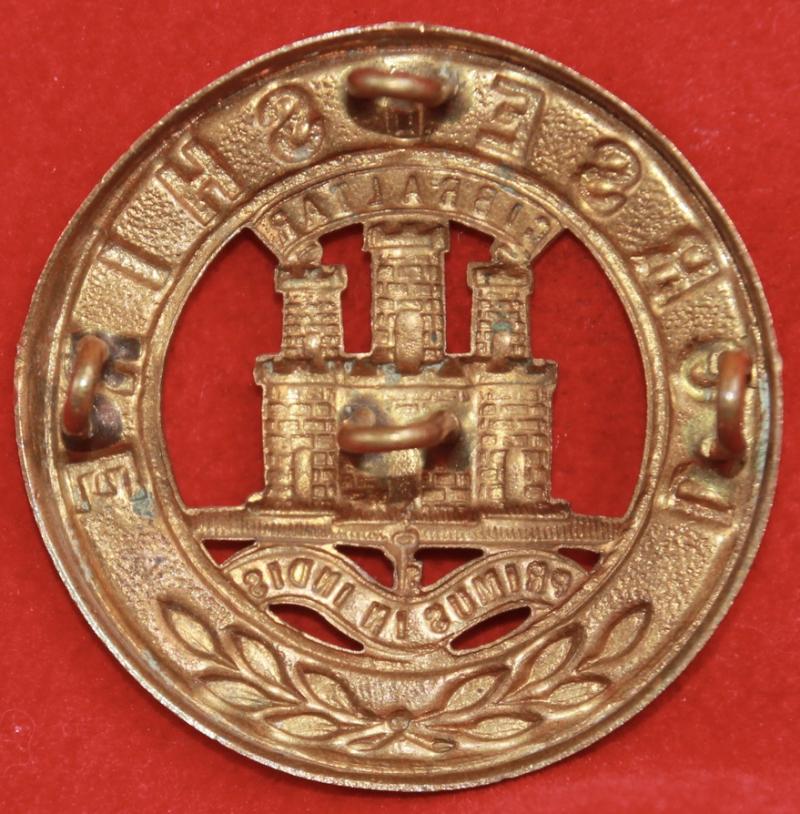 A later, three towers pattern, brass helmet plate centre for The Dorsetshire Regiment with all four of its staple-style loop fastenings. KK330.
