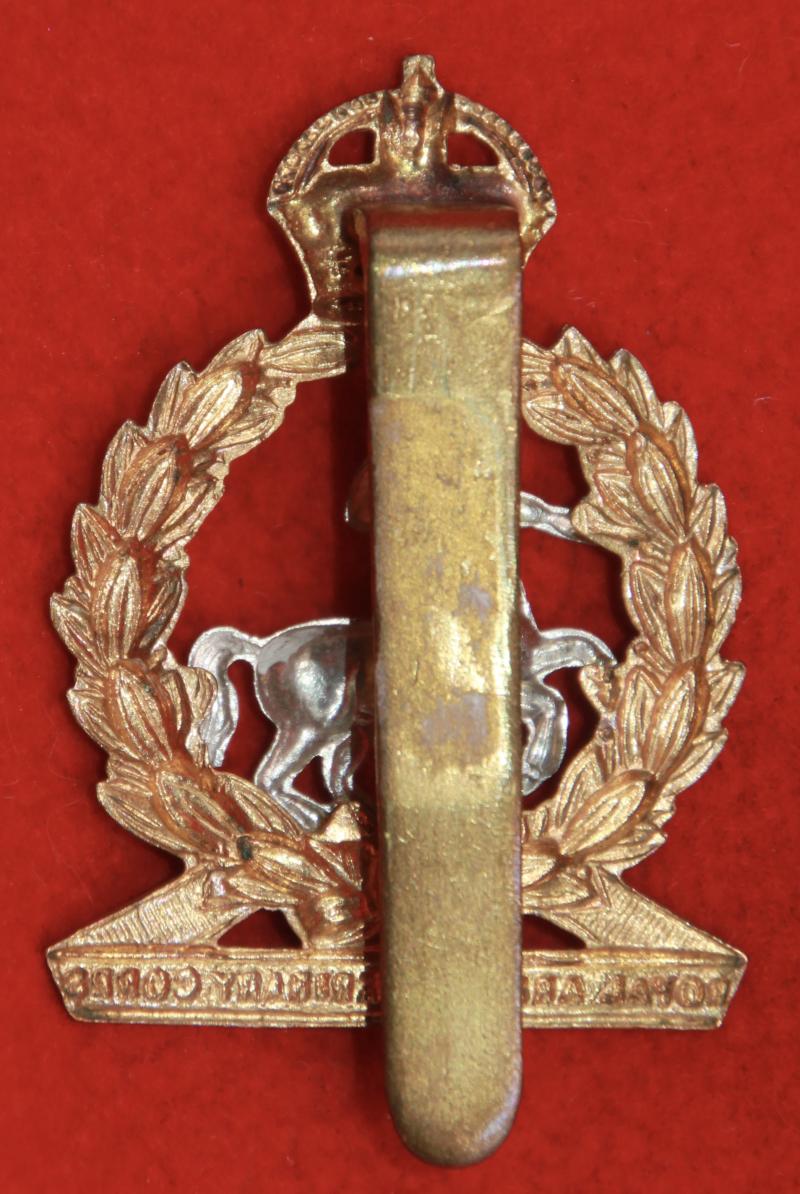 A bi-metal cap badge for The Royal Army Veterinary Corps with a slider fastening. KK1044.