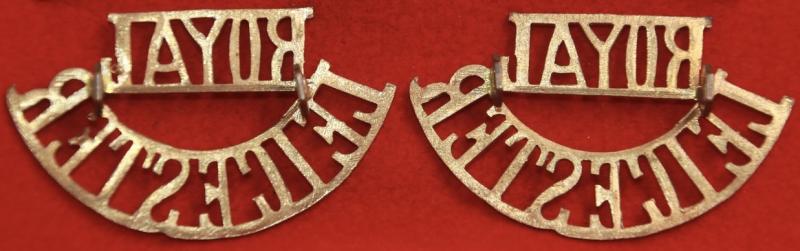 A pair of brass shoulder titles for The Royal Leicestershire Regiment, each with two hexagonal lug fastenings (east and west). Westlake 910.