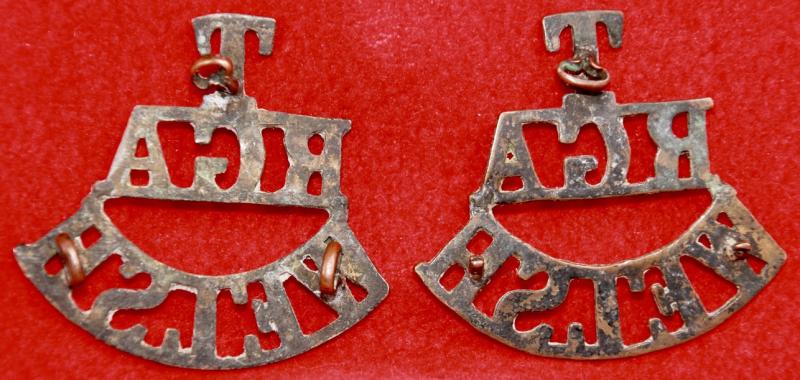 A pair of brass shoulder titles for The Welsh (Carnarvonshire, territorial) heavy battery of The Royal Garrison Artillery. Westlake 683.