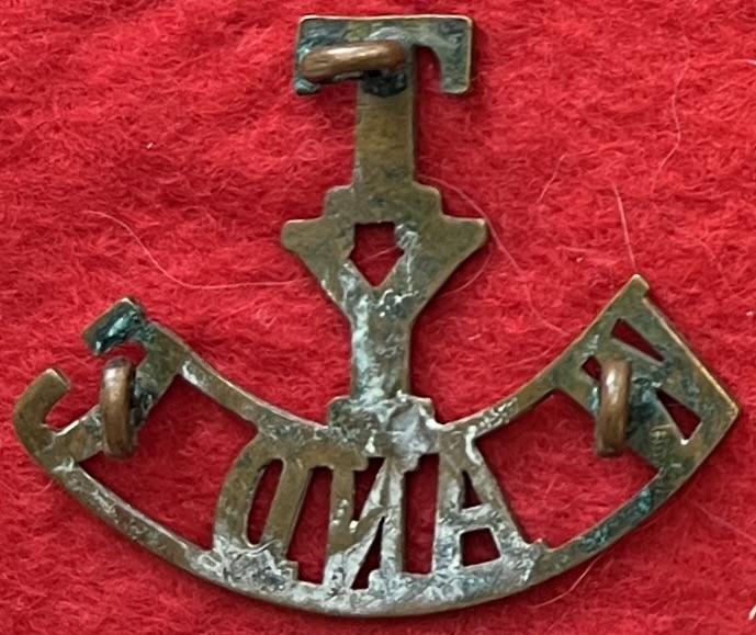 A brass shoulder title for the Westmorland & Cumberland Yeomanry with three lug fastenings (north, east and west). Westlake 257.