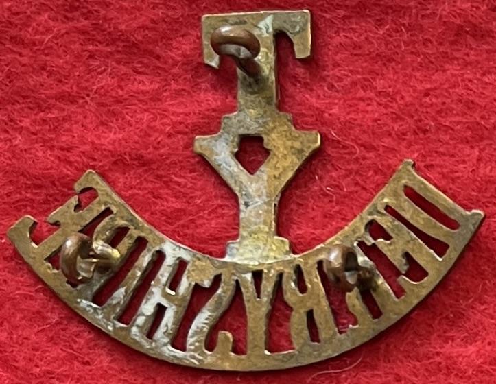 A brass shoulder title for The Derbyshire Yeomanry with three lug fastenings (north, east and west).