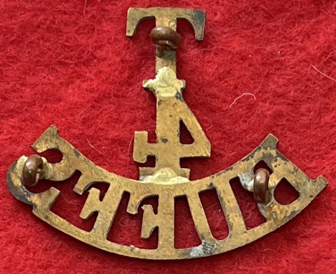 A brass shoulder title for the 4th (territorial) battalion of The Buffs (Royal East Kent Regiment) with three lug fastenings (north, east and west). Westlake 749.