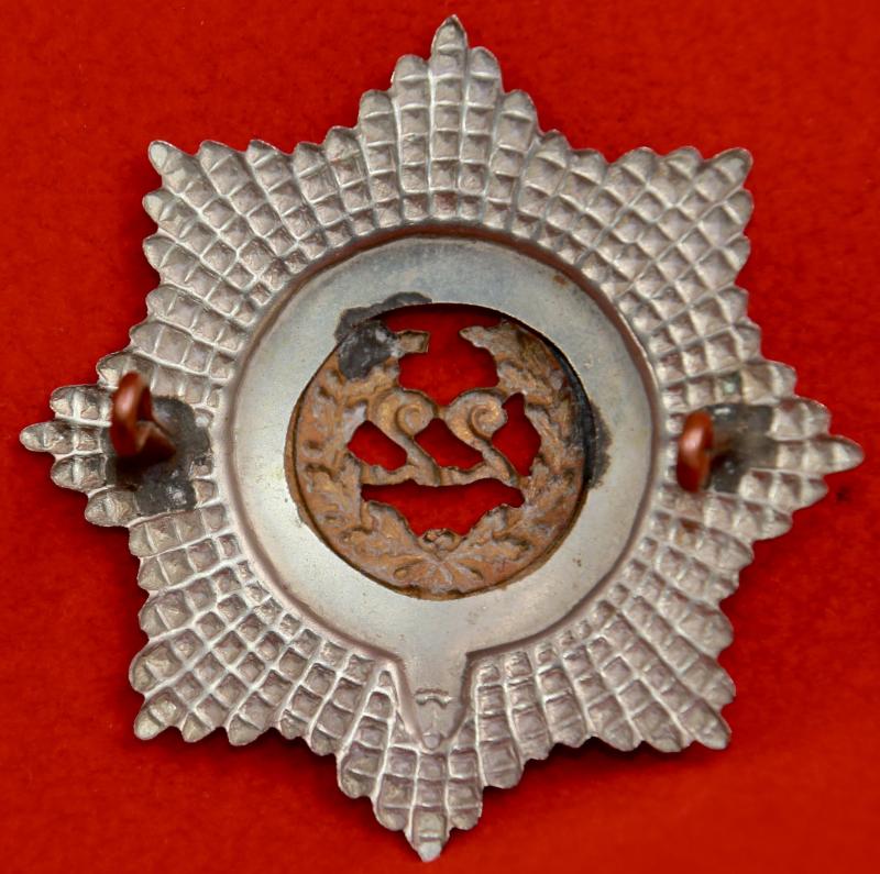 A voided pattern, bi-metal, pouch badge for a bandsman of The Cheshire Regiment with two lug fastenings (east and west). Approximately 65mm x 65mm.