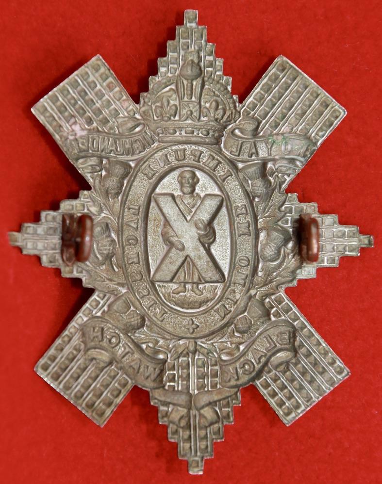 A rare, white metal, glengarry badge for the 4th-7th (territorial) battalions of The Black Watch (Royal Highland Regiment) with two lug fastenings (east and west, one opened up). KK1736.