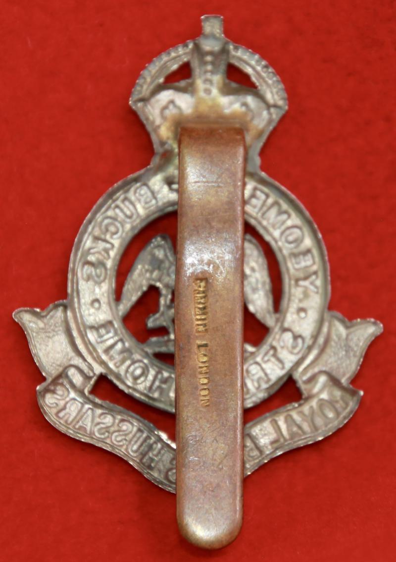 A white metal cap badge for The Royal Buckinghamshire Hussars with a slider fastening (marked Firmin London). KK1441.