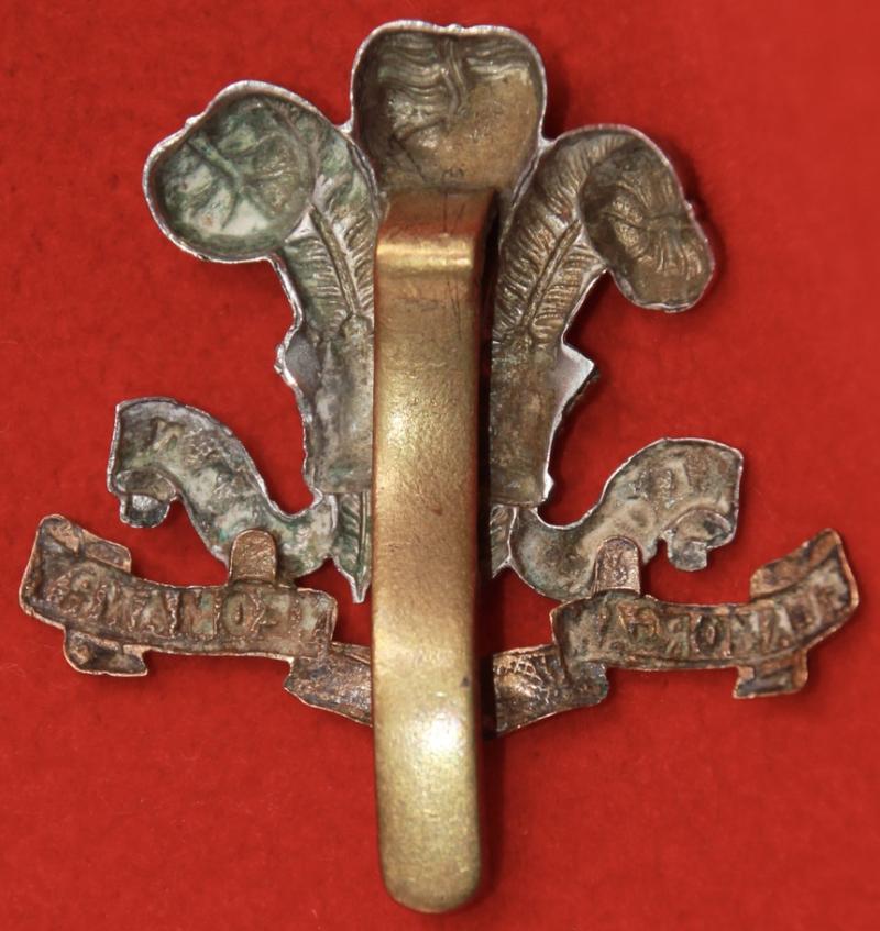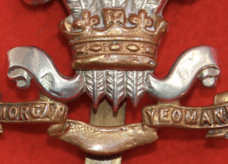 A nice, bi-metal, cap badge for The Glamorgan Yeomanru with a slider fastening. KK1481 Note: This badge appears to have had the word 'Imperial' erased but, curiously, also has the Ich Dien motto polished away too.