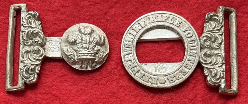 A scarce, silvered, waist-belt clasp for an officer of The Renfrewshire Rifle Volunteers. Curiously, this WBC has two sets of matching benchmarks (28 and 100). Bloomer book 1, page 117.