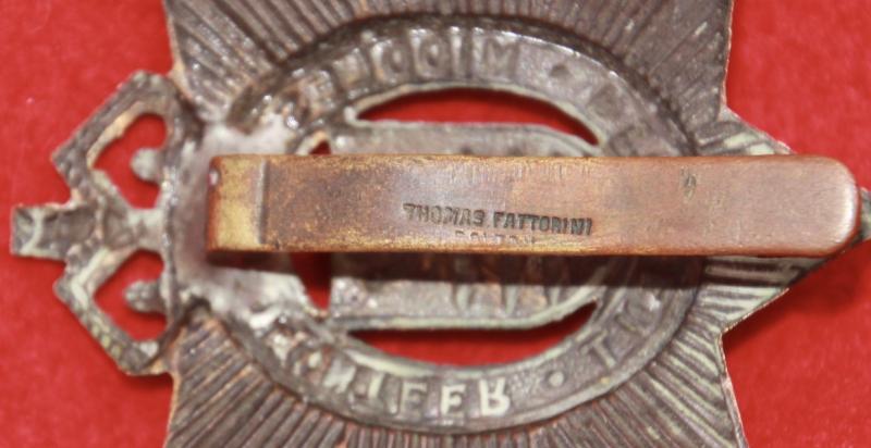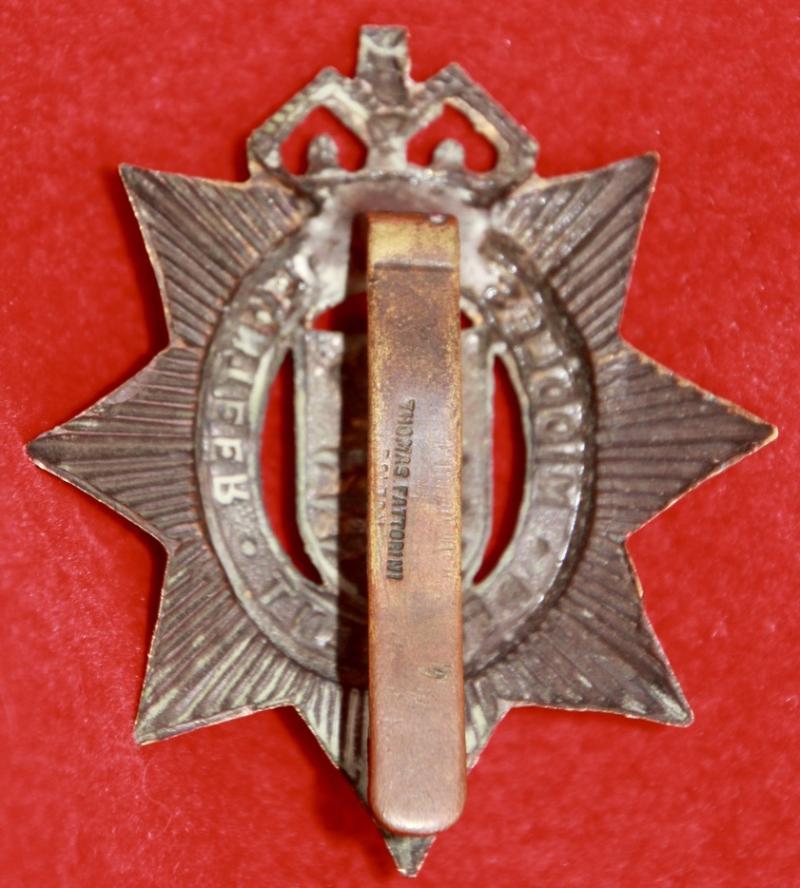 A bronzed cap badge for The Middlesex Volunteer Regiment, part of the WW1 Volunteer Training Corps movement, with (unusually) a slider fastening (marked for manufacturer Thomas Fattorini Bolton). KK1666.