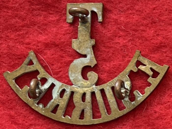 A brass shoulder title for the 5th (territorial) battalion of The East Surrey Regiment with three lug fastenings (north, east and west). Westlake 1043.
