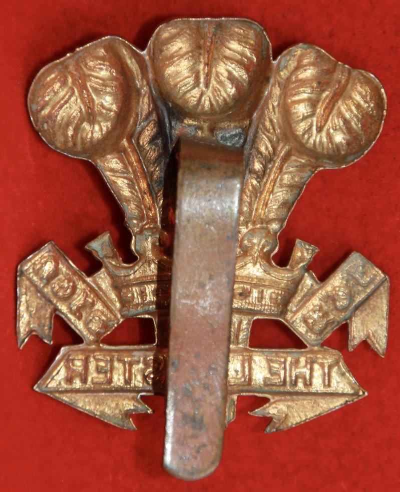 A WW1 economy issue, brass, cap badge for The Leinster Regiment (Royal Canadians) with a slider fastening. KK699.