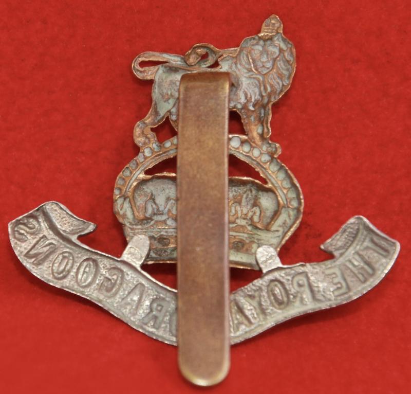 A bi-metal cap badge for The 1st (Royal) Dragoons with a slider fastening. KK751.