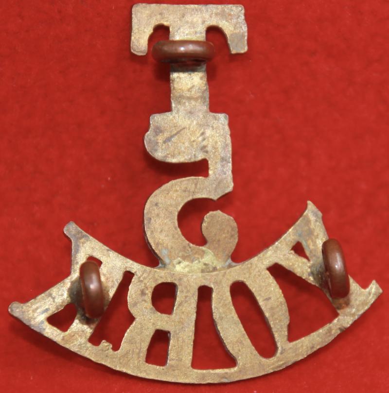 A brass shoulder title for the 5th (territorial) battalion of The Yorkshire Regiment (Alexandra, Princess of Wales's Own Yorkshire Regiment), The Green Howards, with three lug fastenings (north, east and west). Westlake 927.
