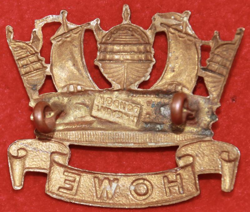 A nice, brass, cap badge for The Royal Naval Division, Howe Battalion, with two lug fastenings (east and west). The reverse bears a plaque for manufacturer J.R. Gaunt London. KK1164.