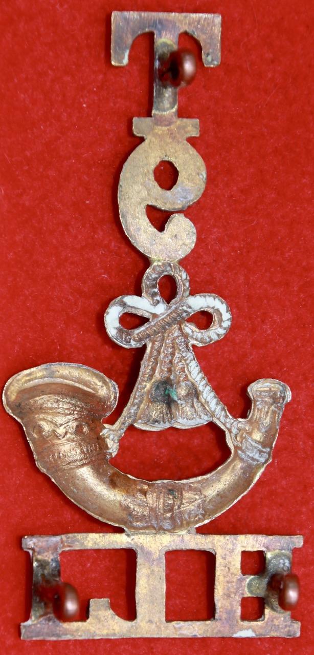 A scarce, brass, shoulder title for the 9th (territorial) battalion of The Highland Light Infantry (City of Glasgow Regiment) with three lug fastenings (north, east and west). Westlake 1363.