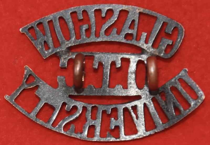 A (slightly faded) blackened brass shoulder title for The Glasgow University Officer Training Corps with two lug fastenings (east and west). Westlake 1637.