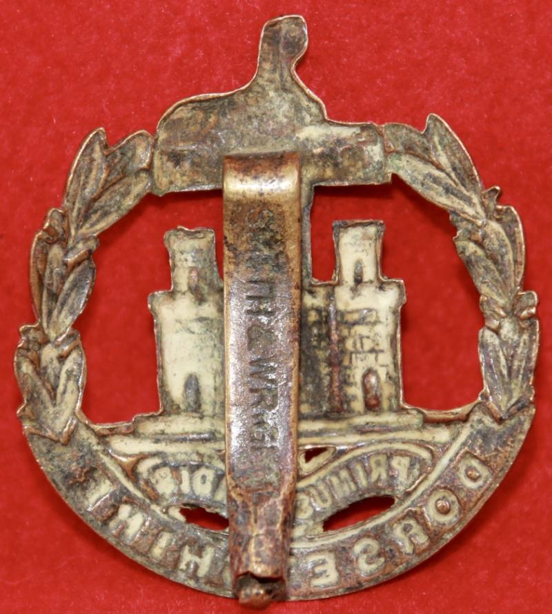 A WW1 economy issue, brass, cap badge for The Dorsetshire Regiment with a slider fastening (marked Smith & Wright Ld B'ham - partially obscured from twists/damage to the slider). Some polish. KK651.
