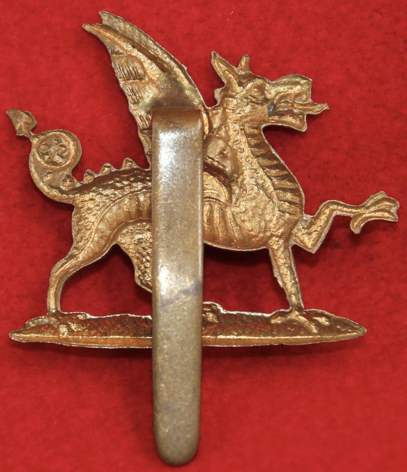 A brass cap badge for the 1st battalion of The Monmouthshire Regiment with a slider fastening. KK1769.