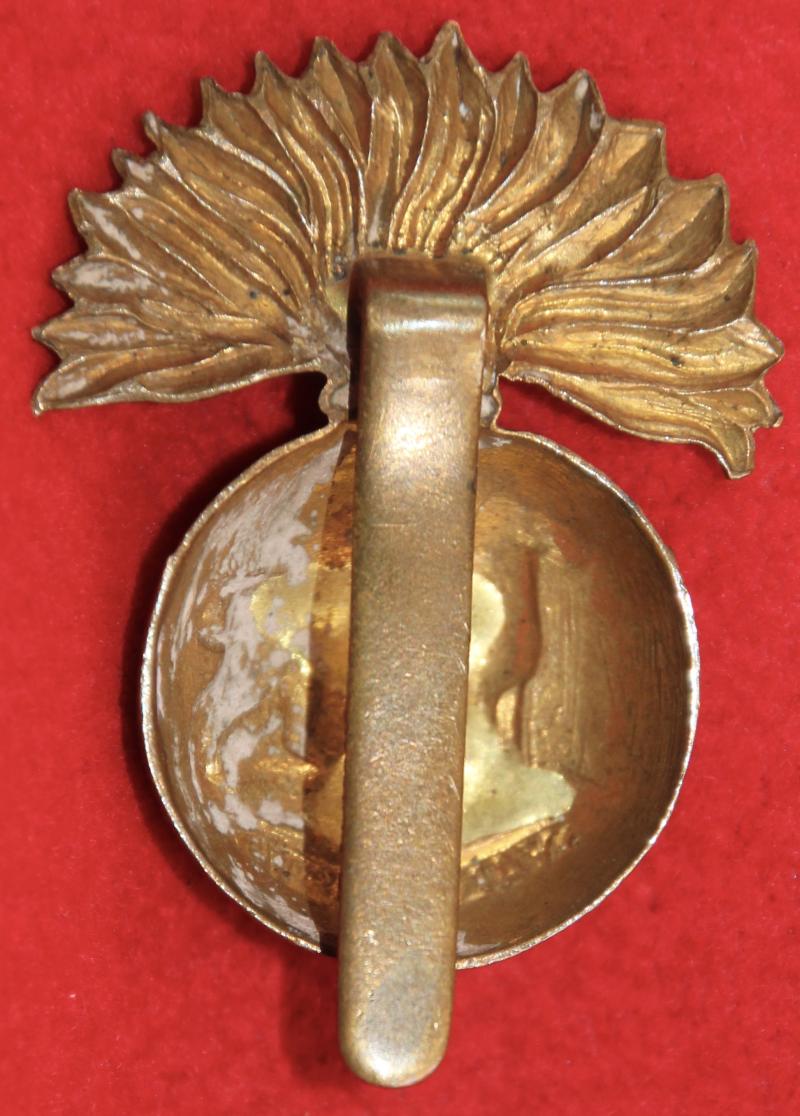 A bi-metal cap badge for The Royal Munster Fusiliers with a slider fastenings and 'sweathole' construction. KK701. Note: The flames on this example are unusually flat.