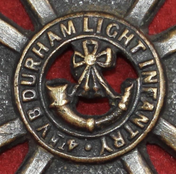 A Victorian, blackened brass, cap badge for the 4th volunteer battalion of The Durham Light Infantry with two lug fastenings (east and west). Headquarters at Durham.