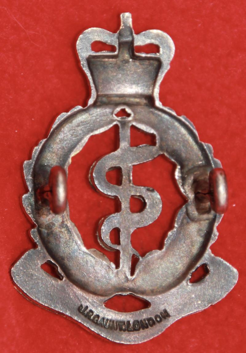 A post-1952, silver-plated and gilt, cap badge for an officer of The Royal Army Medical Corps with two lug fastenings (east and west). The reverse is marked for manufacturer J.R. Gaunt London. KK2123.