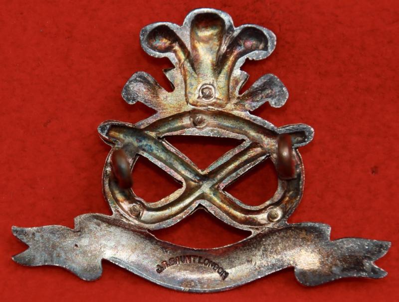 A silver-plated and gilt cap badge for an officer of The North Staffordshire Regiment with two lug fastenings (east and west). The reverse is marked for manufacturer J.R. Gaunt London. KK678.