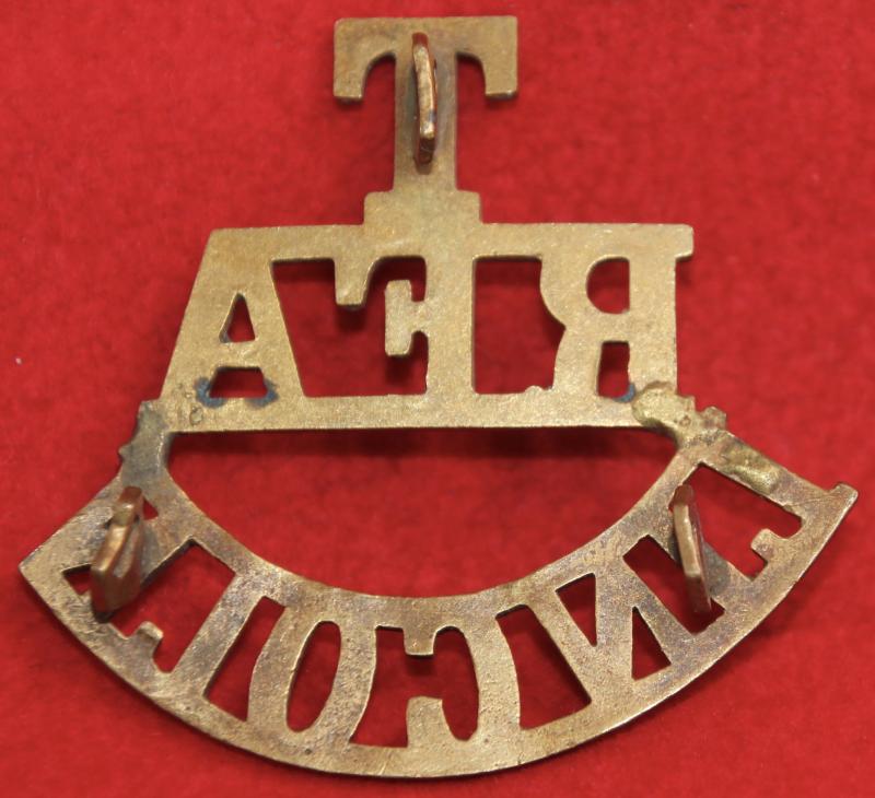 A brass shoulder title for the Lincolnshire (territorial) battery of The Royal Field Artillery with three hexagonal lug fastenings (north, east and west). Westlake 628.
