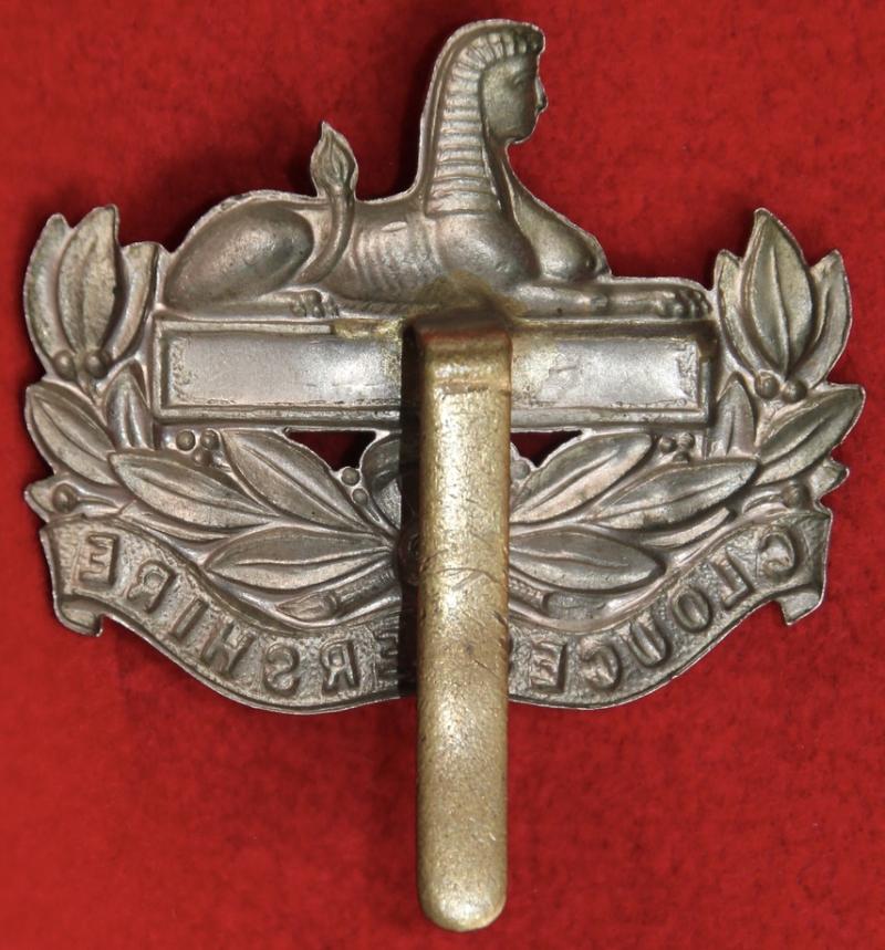 A white metal cap badge for the 5th and 6th (territorial) battalions of The Gloucestershire Regiment with a slider fastening. KK1720. Note: It looks like the Egypt honour has been erased/the die 'hobbed'.