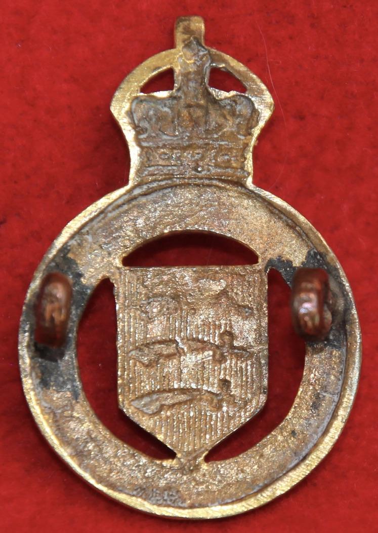 A scarce, (slightly faded) gilt, cap/collar badge for an officer of The Essex Imperial Yeomanry/Essex Yeomanry with two short lug fastenings (east and west). KK1490 or Wood 15/19.