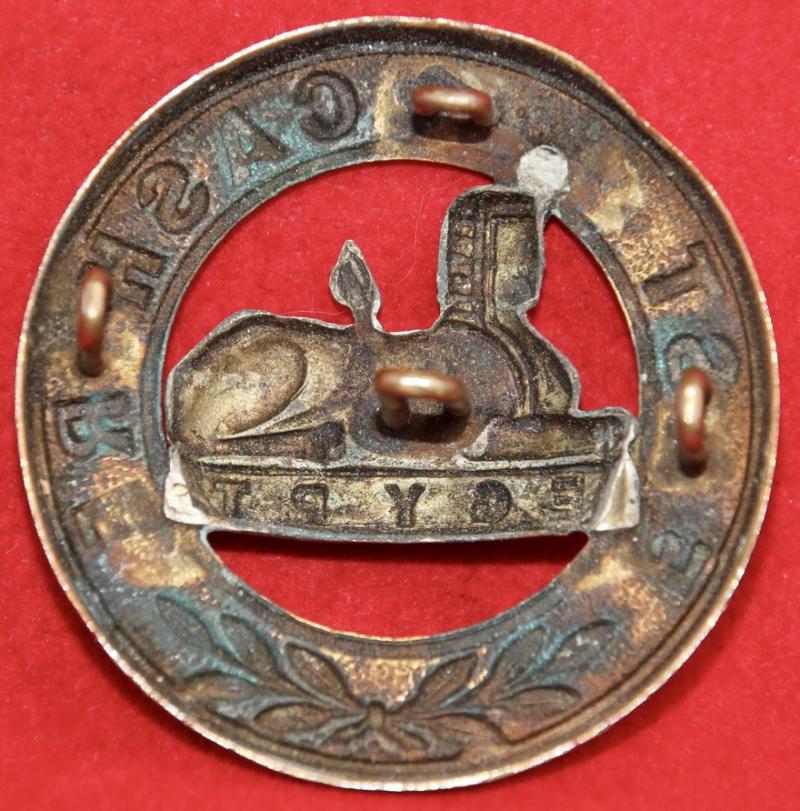 A bi-metal helmet plate centre for The East Lancashire Regiment with all four of its staple-style lug fastenings intact. KK320.