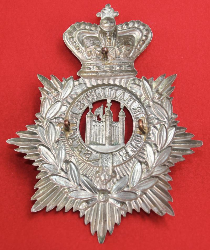 A scarce, white metal, helmet plate for The Tower Hamlets Rifles with three lug fastenings (north, east and west) and a green felt backing.