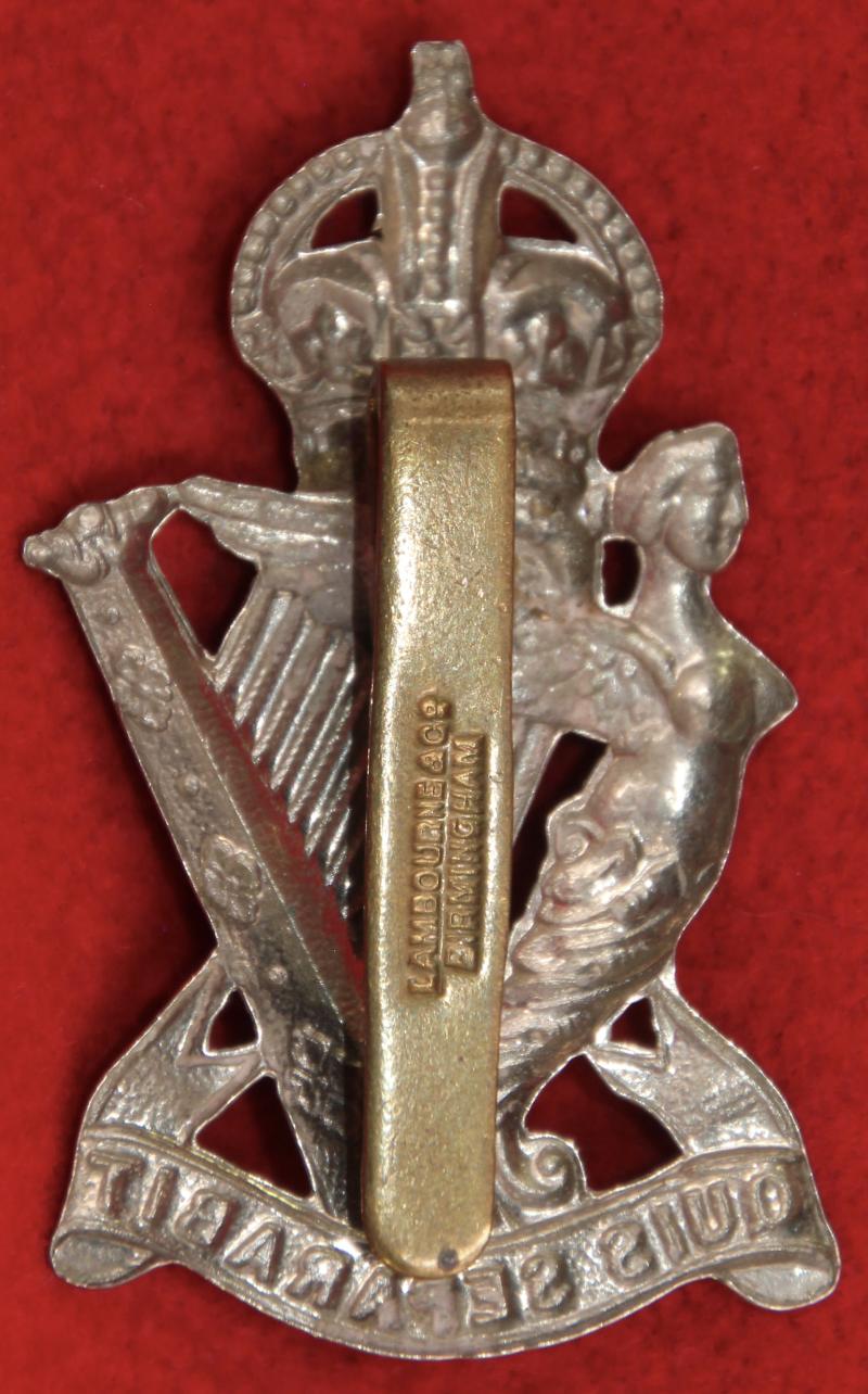 A white metal cap badge for The Royal Irish Rifles with a 'hairpin' slider fastening (marked Lambourne & Co Birmingham). KK691.