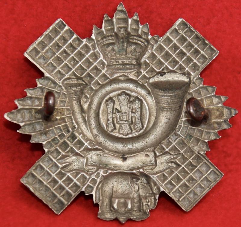 A white metal glengarry badge for a volunteer/militia battalion of The Highland Light Infantry (City of Glasgow Regiment) with two lug fastenings (east and west). As KK684.
