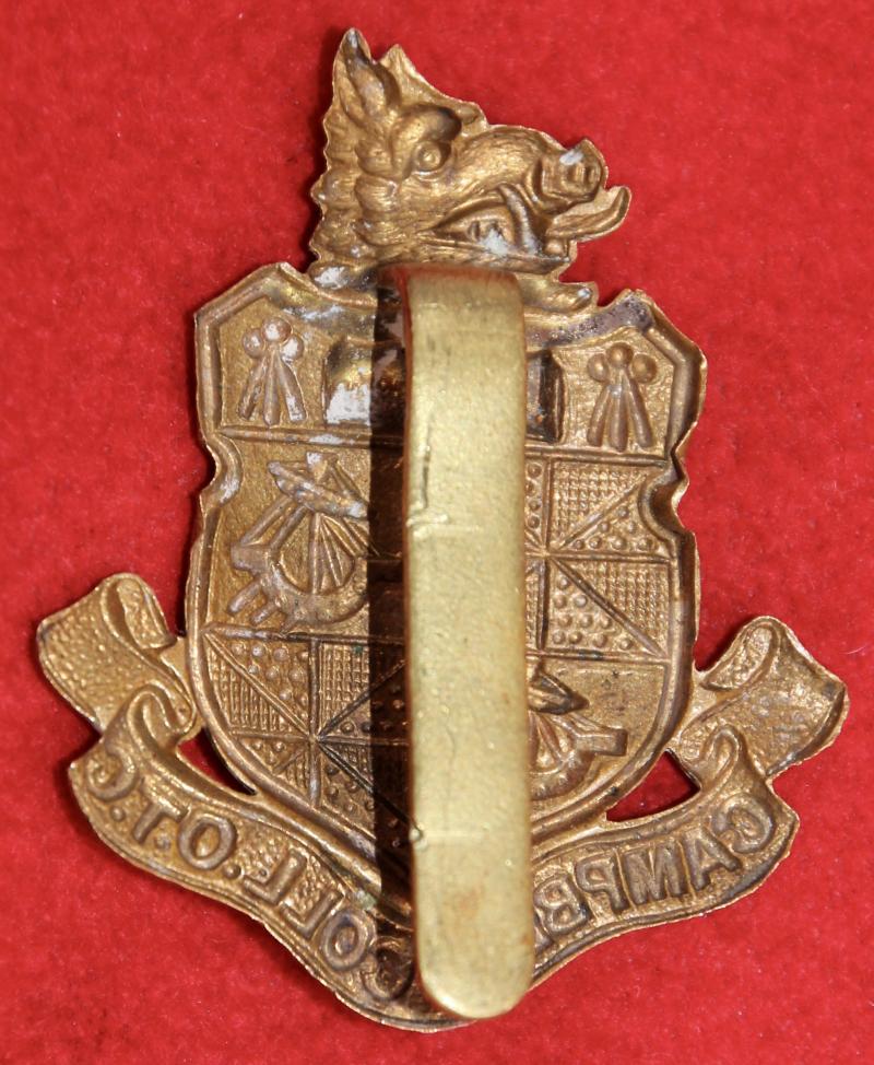 A brass cap badge for The Campbell College (Belfast) Officer Training Corps with a slider fastening. KK2521.
