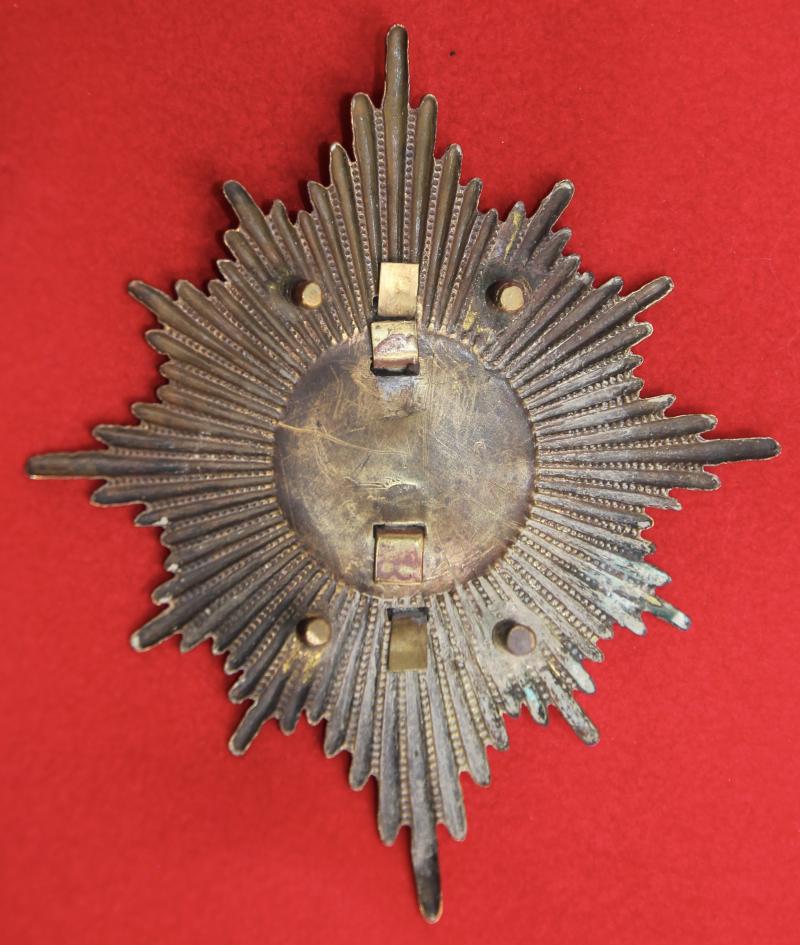 A scarce, bi-metal, helmet plate for The 1st Royal Dragoons with four screw fastenings and a black leather backing to the centre. KK713.