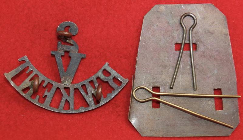 A scarce, blackened brass, shoulder title for the 2nd volunteer battalion of the Royal West Kent Regiment with three lug fastenings (north, east and west) and its backplate intact. Headquarters at Blackheath.