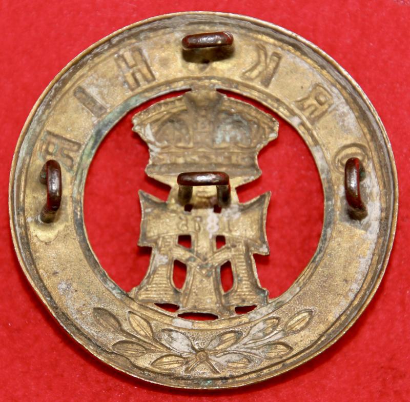 A brass helmet plate centre for The Green Howards (Alexandra, Princess of Wales's Own Yorkshire Regiment) with all four of its staple-style loop fastenings intact. KK308.