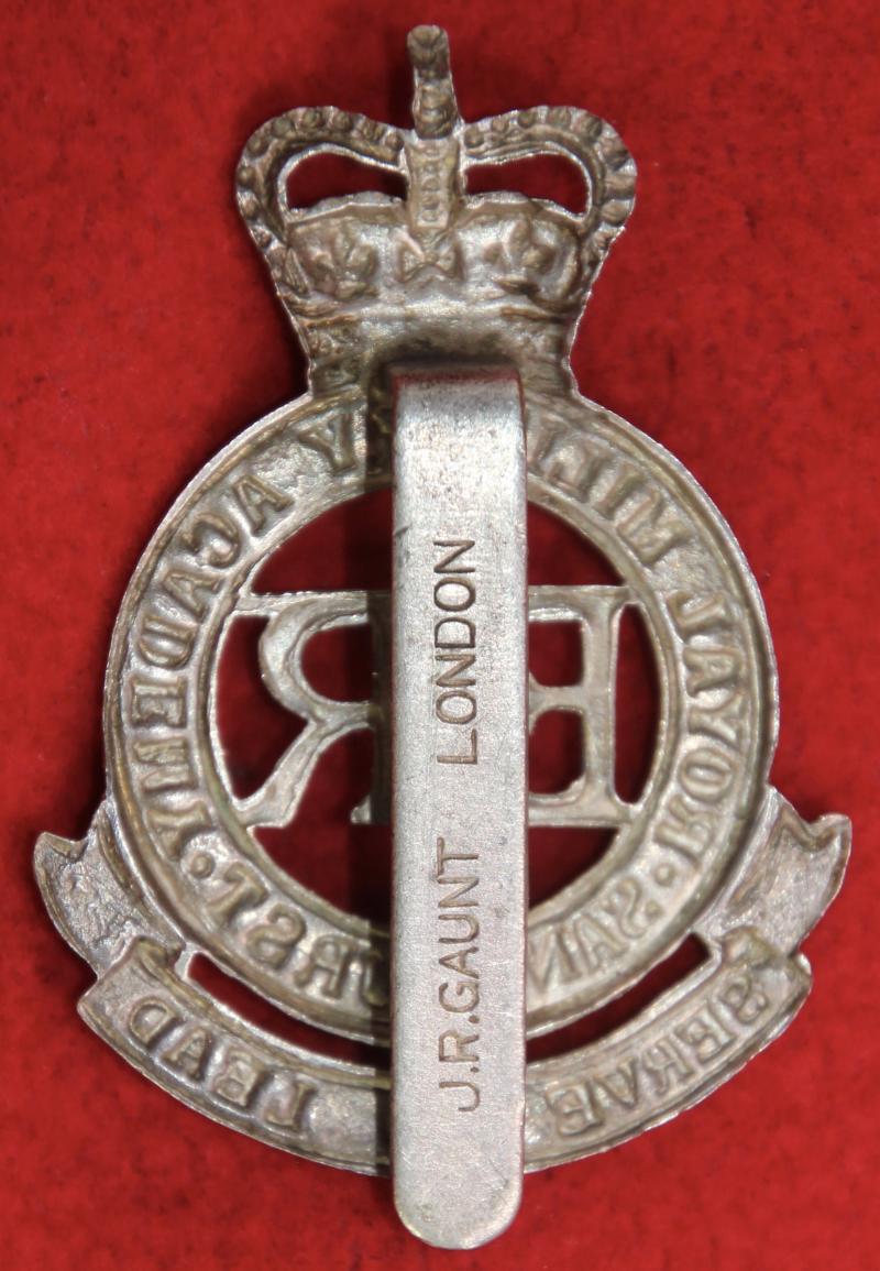 A post-1952 pattern, silver-plated, cap badge for The Royal Military Academy (Sandhurst) with a slider fastening (marked J.R. Gaunt London). KK2171.