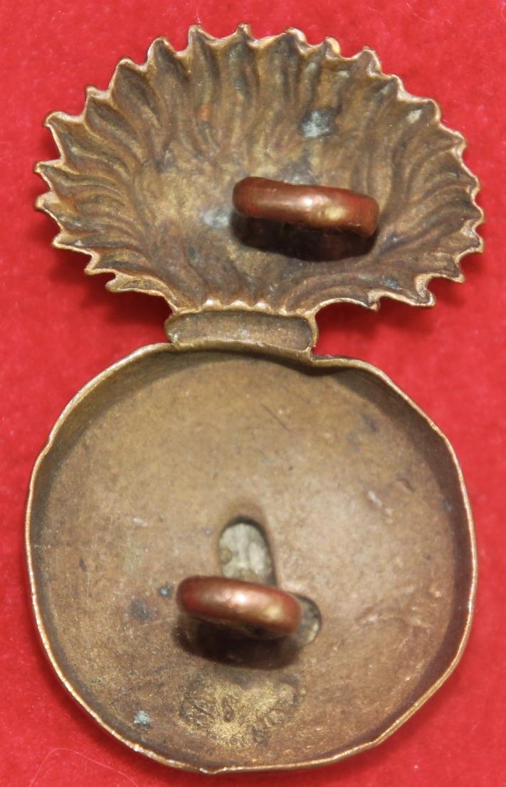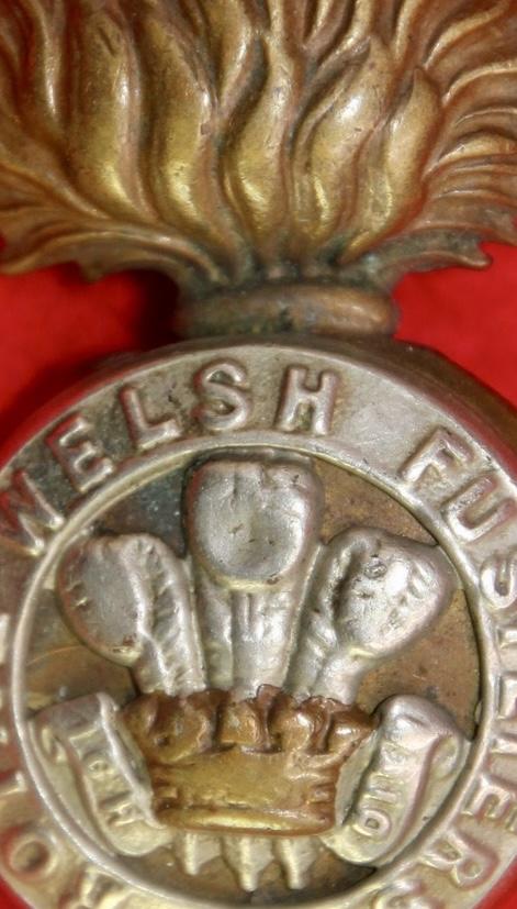 A bi-metal cap badge for The Royal Welsh Fusiliers with two lug fastenings (north and south) and 'sweathole' construction, which suggest it to be a Victorian/Edwardian example. KK622.