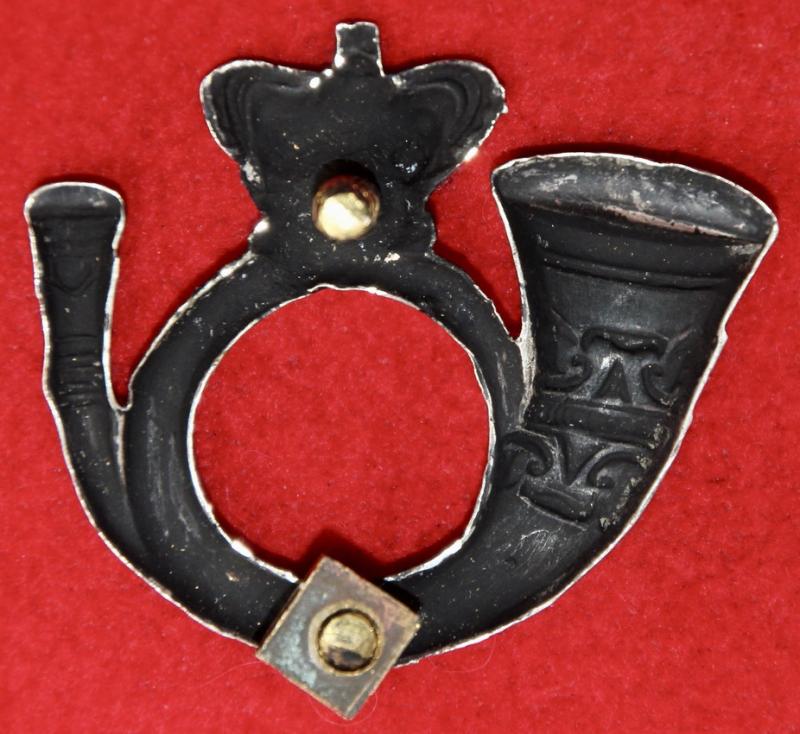 A generic, silvered, pouch badge for an officer of a volunteer/rifle volunteer unit with two screw fastenings (north and south). One nut remains intact.