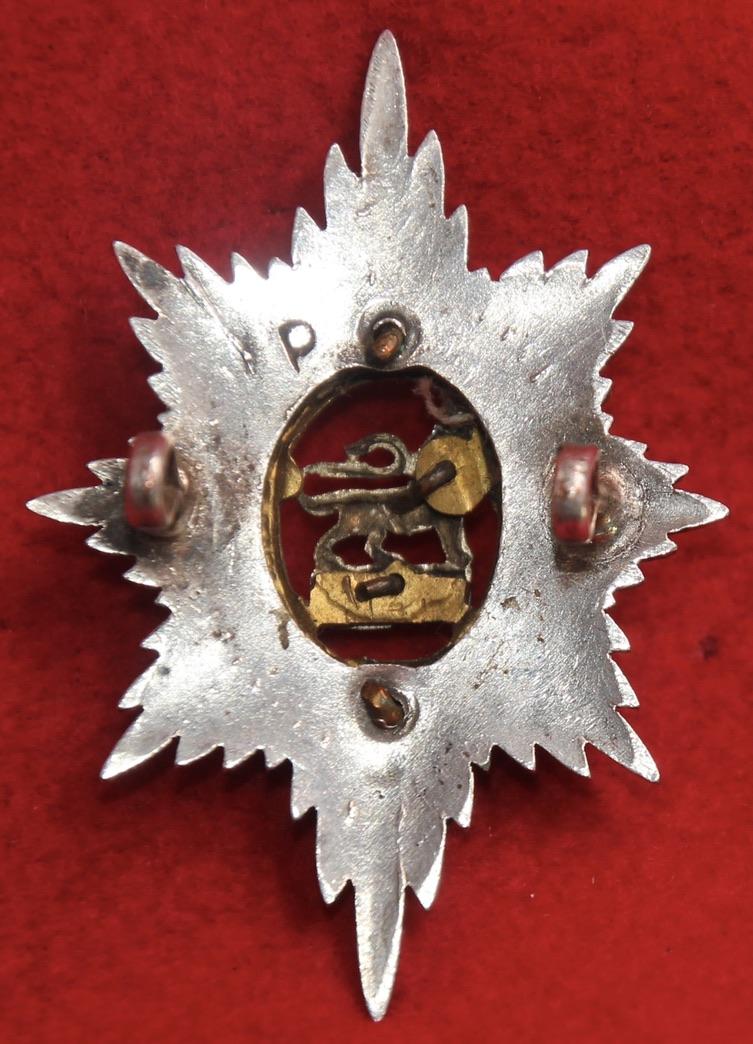 A post-1928, silver-plated and gilt, cap badge for an officer of The Worcestershire Regiment with two lug fastenings (east and west). The reverse is stamped 'P' to indicate silver plate. KK1991.
