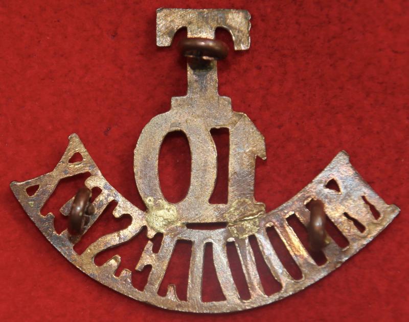 A brass shoulder title for the 10th (territorial) battalion of The Middlesex Regiment with three lug fastenings (north, east and west). Westlake 1285.