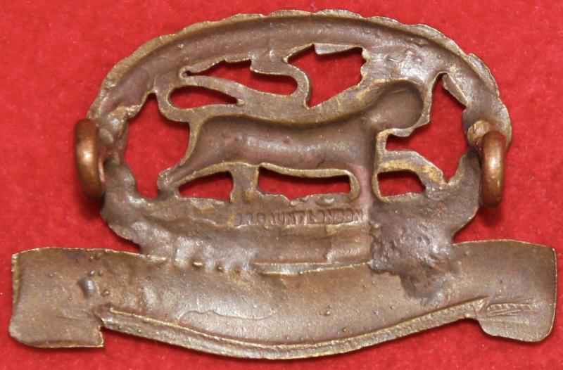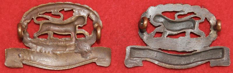Note: One has a void between the wreath and the scroll while the other does not - both types described in Colin Churchill's book on the History of The British Army Infantry Collar Badge.