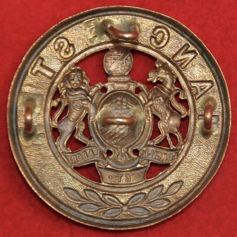 A brass helmet plate centre for The Manchester Regiment with all four of its staple-style loop fastenings intact. KK347.