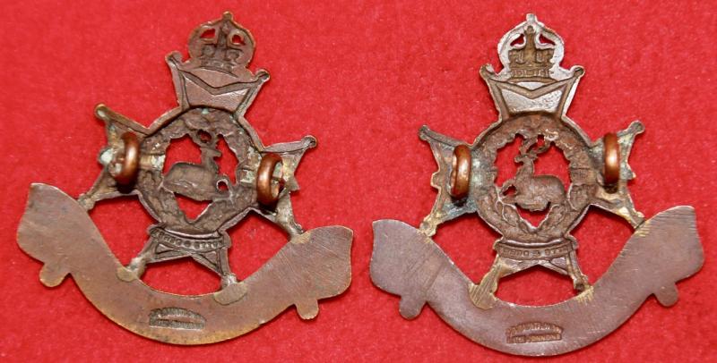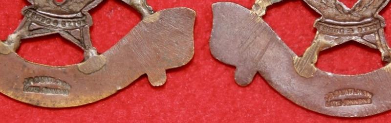 A pair of officer's service dress, bronzed, collar badges for The Sherwood Foresters (Nottinghamshire & Derbyshire Regiment), each with two lug fastenings (east and west). The reverse of each is stamped J.R. Gaunt London, Late Jennens. Churchill 1260.