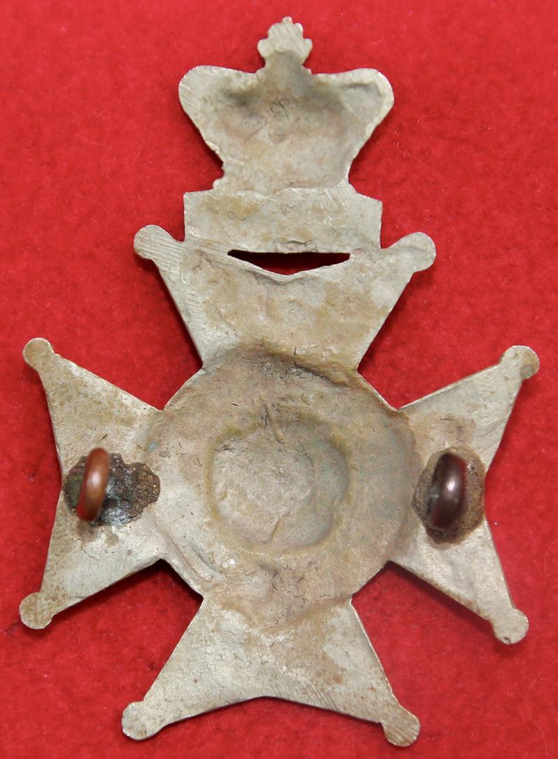 A cast, white metal, glengarry badge for The 1st Hampshire Rifle Volunteer Corps with two lug fastenings (east and west). Approximately 59mm tall x 42mm wide. Woods 3.28.