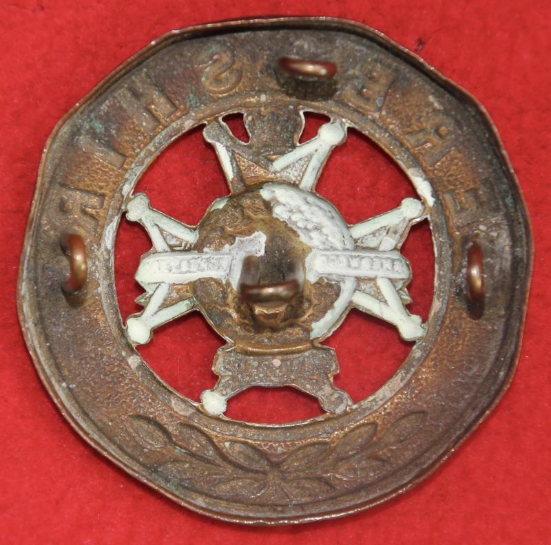 A brass helmet plate centre for The Derbyshire Regiment with all four of its staple-style loop fastenings intact. Some polish. KK336.