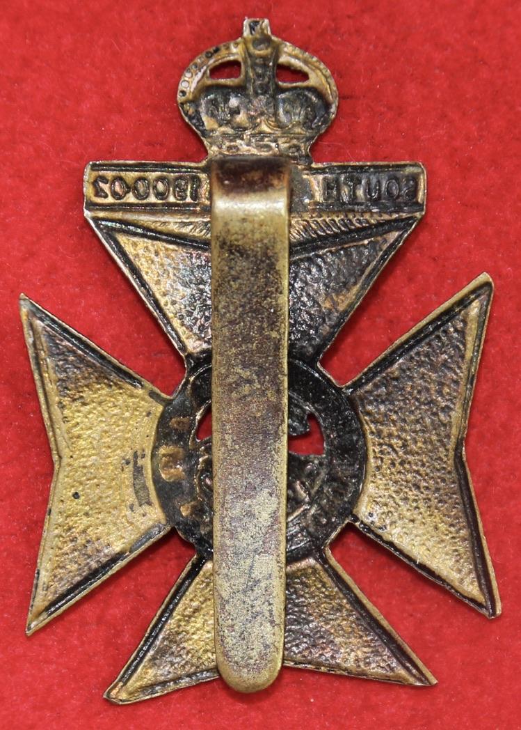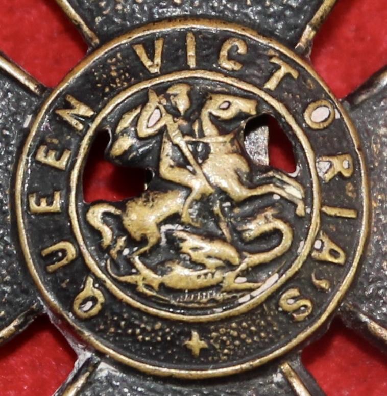 A (somewhat faded) blackened brass cap badge for the 9th battalion of The London Regiment (Queen Victoria's Rifles) with a slider fastening. KK1828. Note: This is the version with two voids to the centre.