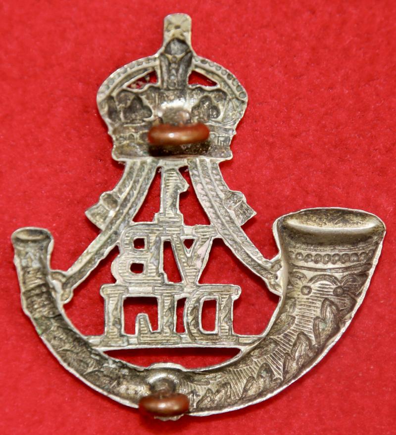 A scarce, white metal, cap badge for the 1st volunteer battalion of The Durham Light Infantry with two lug fastenings (east and west). Headquarters at Stockton-on-Tees.