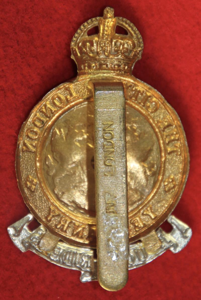A bi-metal cap badge for The City of London Yeomanry (Rough Riders) with a slider fastening (marked J.R. Gaunt London) and 'sweathole' construction. KK2321.